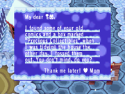 In all five Beast Crossing series games, the player volition frequently receive in-game letters from Mom, purportedly the character'south mother. Letters from Mom usually comprise a modest anecdote nigh life in the graphic symbol's home prior to moving into the town; these anecdotes usually concern sure memories of the histrion that she has, a tale relating to "Dad", or some words of wisdom or guidance.