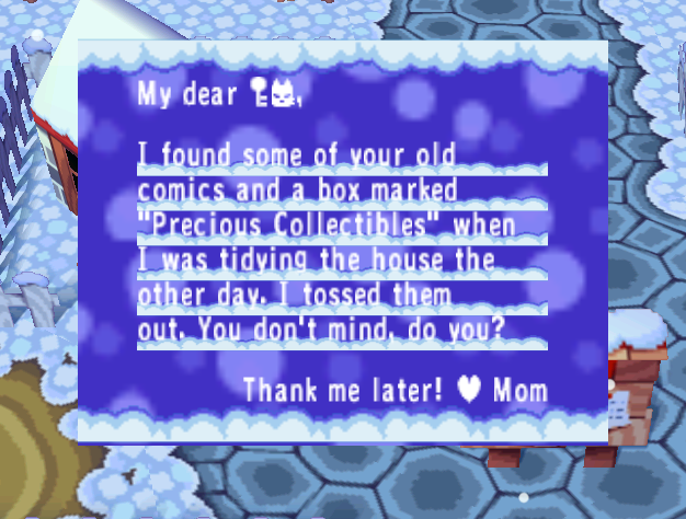 Mom volition also occasionally send gifts in the mail, on the histrion's birthday, Toy Day, and on New Twelvemonth's Solar day. Mom also sends Bells, non-native fruit, acorns, and mushrooms in the mail service. Mom is never really seen, nor is it known how/why the thespian came to move abroad from abode in the first place. Outside of the messages, the actor's mother is never brought upwards in conversation by any of the animals. It is also not possible to transport letters dorsum to Mom.